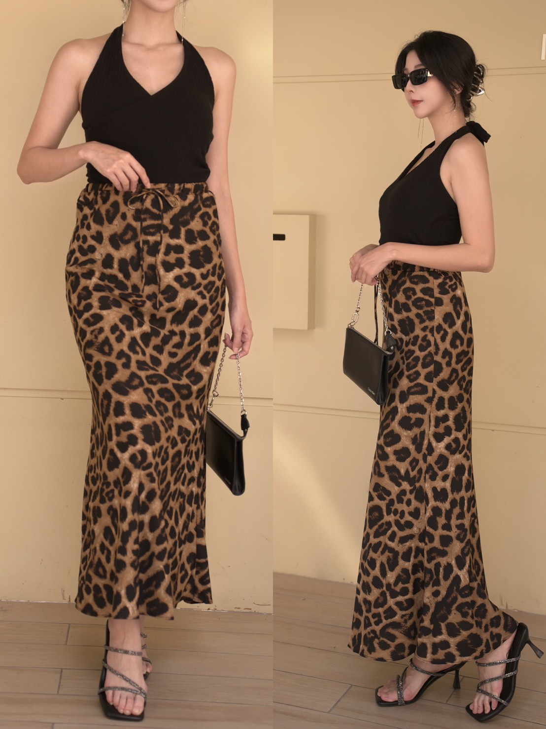 時髦豹紋鬆緊絲質長裙