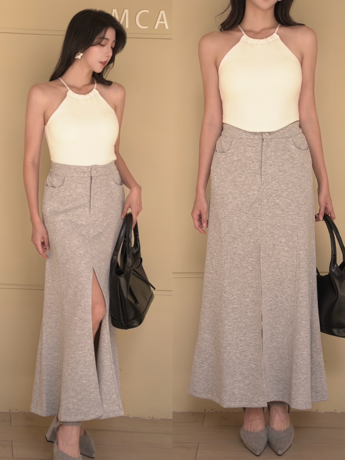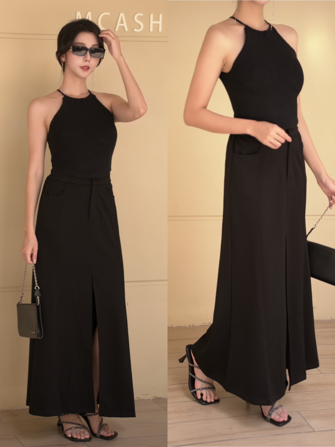 ➤鬆緊空氣棉開岔氣質長裙 (2色)