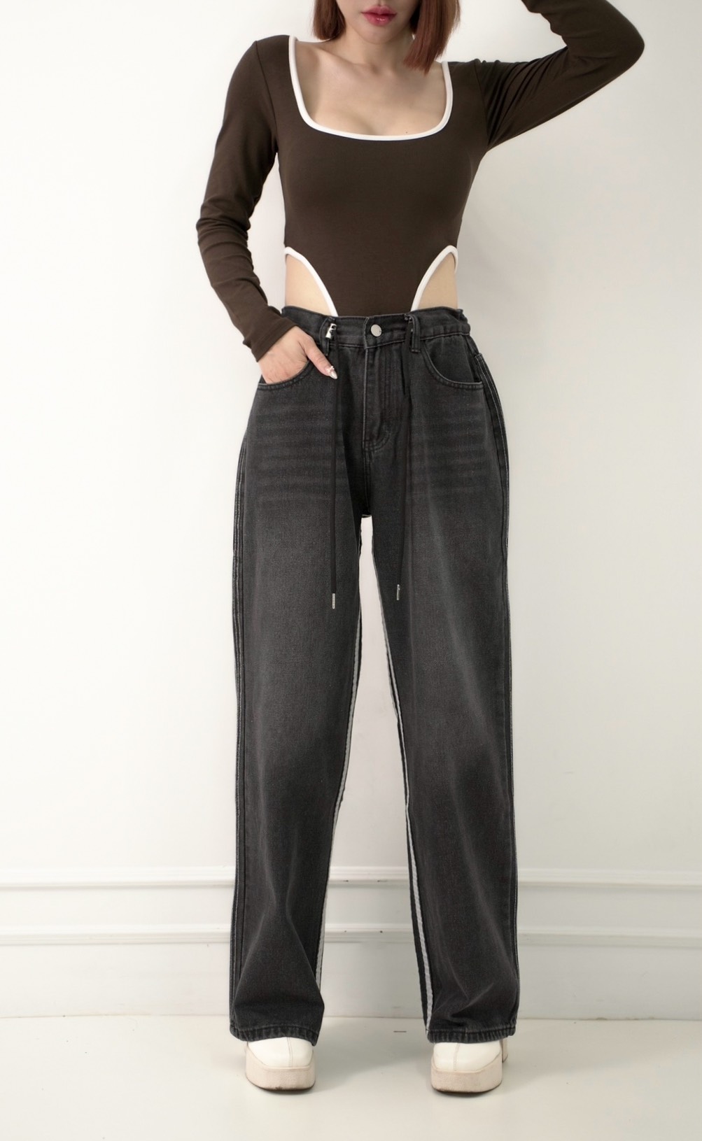 版型描述 | 可高腰或低腰版型偏寬鬆腰圍兩側有調節器可調整腰圍 | ||