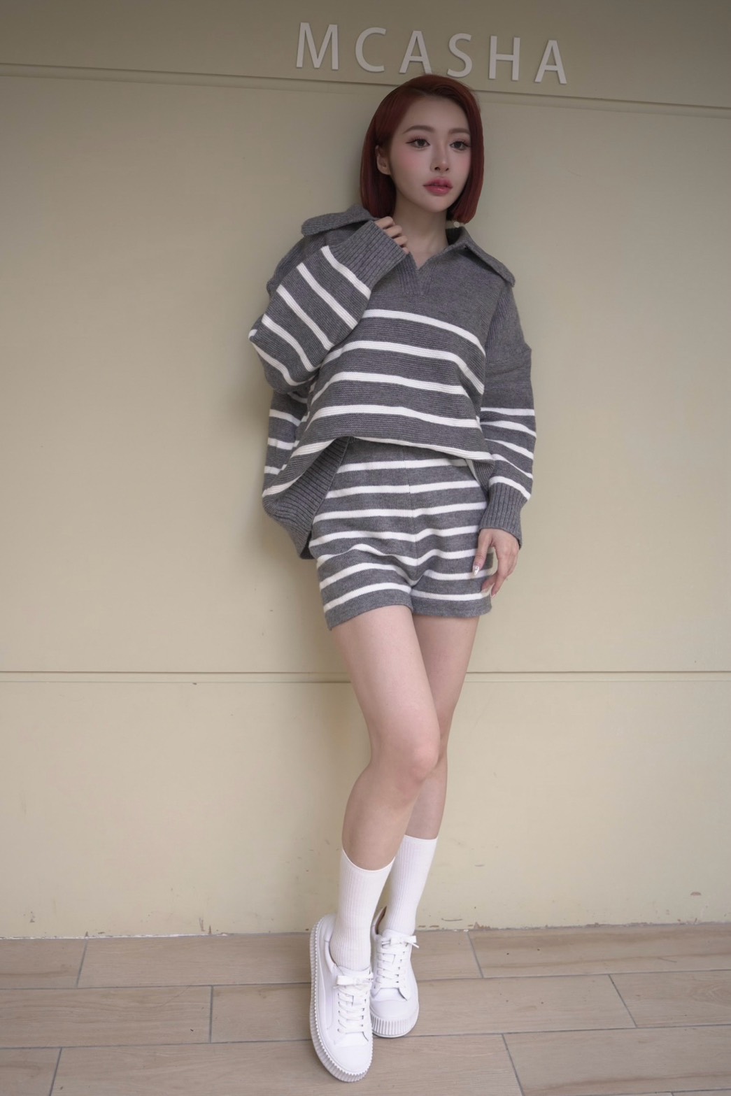 休閒條紋翻領針織上衣搭配鬆緊短褲(3色)