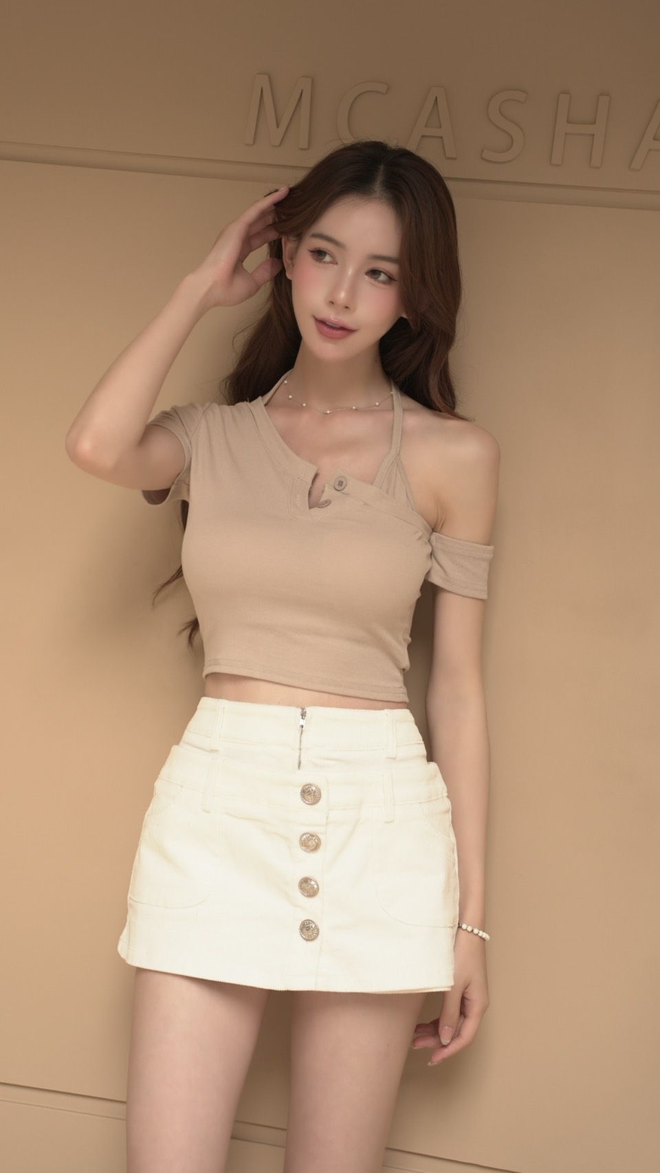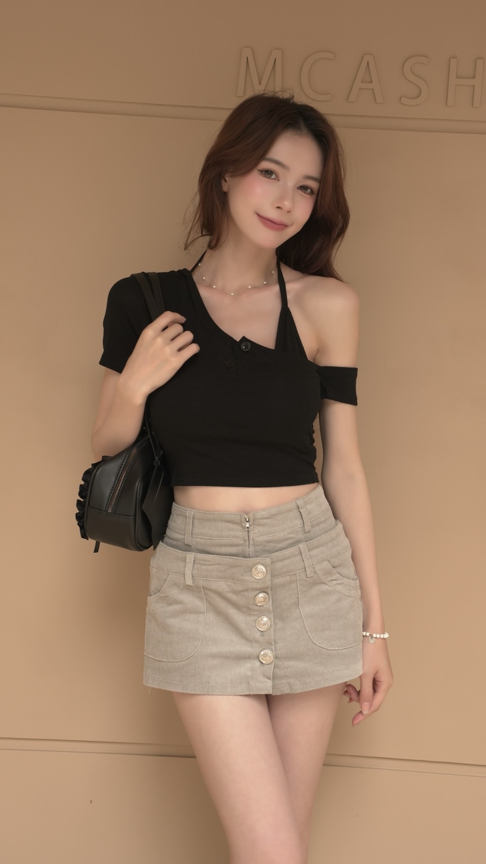 單邊落肩綁脖鈕釦胸墊上衣(5色)